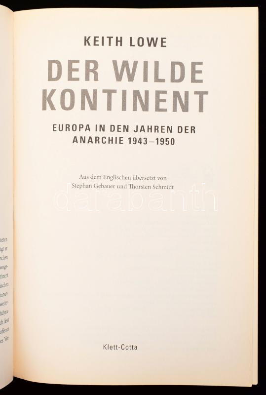 Keith Lowe: Der wilde Kontinent. Europa in den Jahren der Anarchie 1943-1950. Stuttgart, 2016, Klett-Cota, 526+(2) p.+ 8 (fekete-fehér fotók) t. Német nyelven. Kiadói papírkötés.