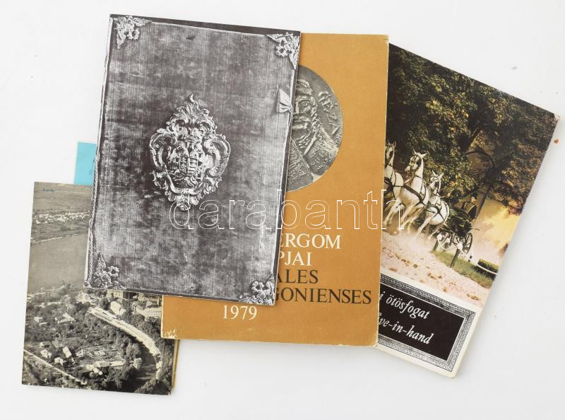 5 db Esztergom és Komárom-Esztergom megye helytörténeti kiadvány: Esztergom évlapjai (Annales Strigonienses) 1979.; Komárom megye bemutatkozik.; Könyvek és oklevelek Esztergomról (kiállÃtási katalógus); Huba László: Esztergom.; Esztergom (orosz nyelvű idegenforgalmi prospektus). Vegyes állapotban.