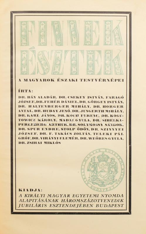 Finnek, észtek. A magyarok északi testvérnépei. Írták: Dr. Kogutovicz Károly, Dr. Szinnyei József, Teleki Pál, Dr. Zsirai Miklós és mások. Bp.,1928, M. Kir. Egyetemi Nyomda, 335 p. Kiadói egészvászon-kötés, kopott borítóval, sérült gerinccel.