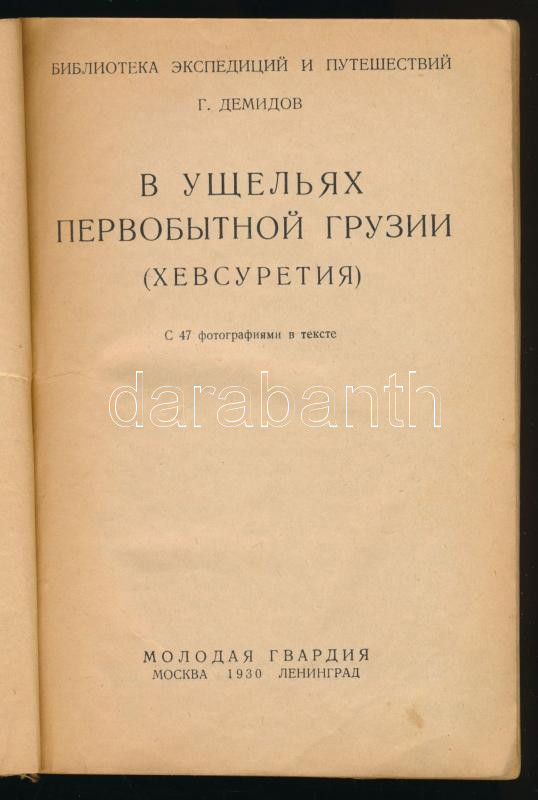 G. Demidov: Az őskori Grúzia szurdokaiban. (Hevszureti). Moszkva-Lenin... https://www.darabanth.com/hu/498-Gyorsarveres/498.0/Konyvek/Konyvek-Utazas-helytortenet~2000121/G-Demidov-Az-oskori-Gruzia-szurdokaiban-Hevszureti-Moszkva-Leningrad-1930-Molodaya-Gvardi~II3401803