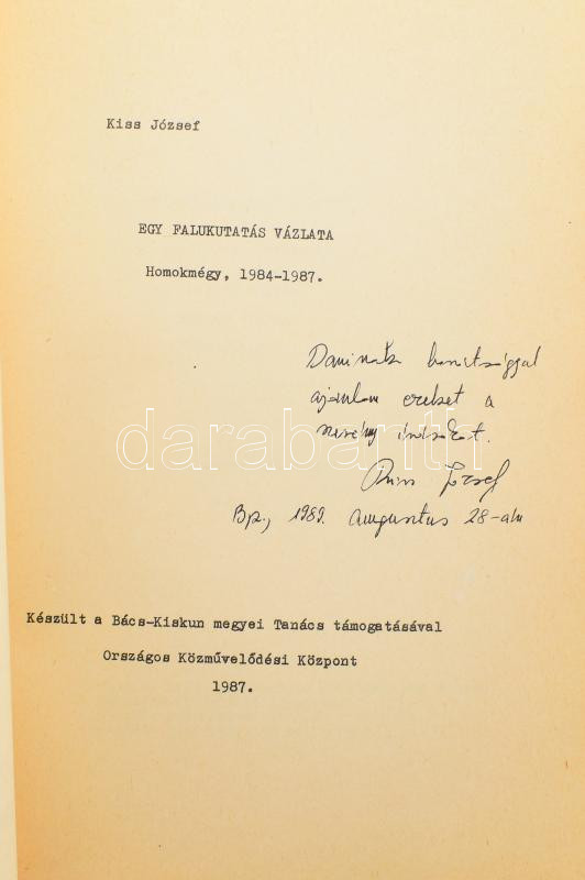 1. köt.: Kiss József: Egy falukutatás vázlata. DEDIKÁLT! Homokmégy, 1984-1987. [Bp.], 1987, Országos Közművelődési Központ, 2+127+1 p. Kiadói papírkötés. Megjelent 300 példányban.;