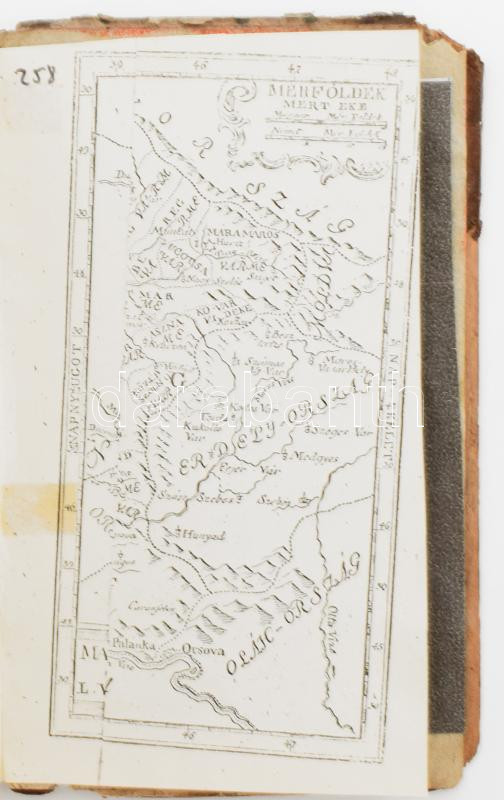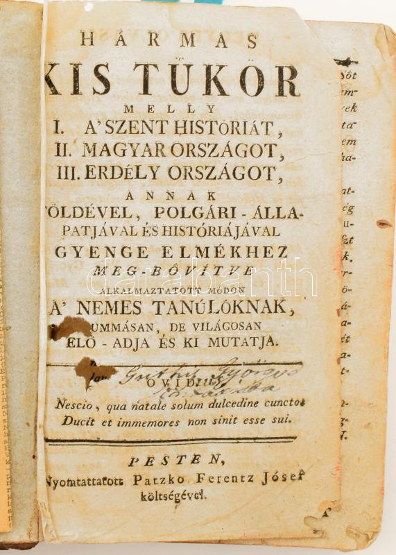 [Losontzi István]: Hármas kis tükör, melly I. a' Szent históriát, II. Magyar országot, III. Erdély országot, annak földével, polgári-állapatjával és históriájával gyenge elmékhez meg-bővítve alkalmaztatott módon a' nemes tanúlóknak, summásan, de világosan elő-adja és ki mutatja. Pesten,én.,Nyomtattatott Patzko Ferentz Jósef költségével, 252+253-257 (pótolt, másolt lapok) p. + 1 (Erdély térképe) t. Korabeli sérült félbőr-kötés, sérült borítóval, egykorú bejegyzésekkel, sérült, lyukas címlappal, foltos lapokkal, benne szakadt, sérült lapokkal is, egy lap részben hiányos (3/4 p.), az utolsó lapok (253-257 p.) másolattal pótoltak, ezek közül egy-két lap kijár, a 2. térképet (258 p.) hiányosan másolták le, beragasztott cikkel és pótlást végző intézmény számlájával. Rossz, restaurálásra szoruló állapotban.