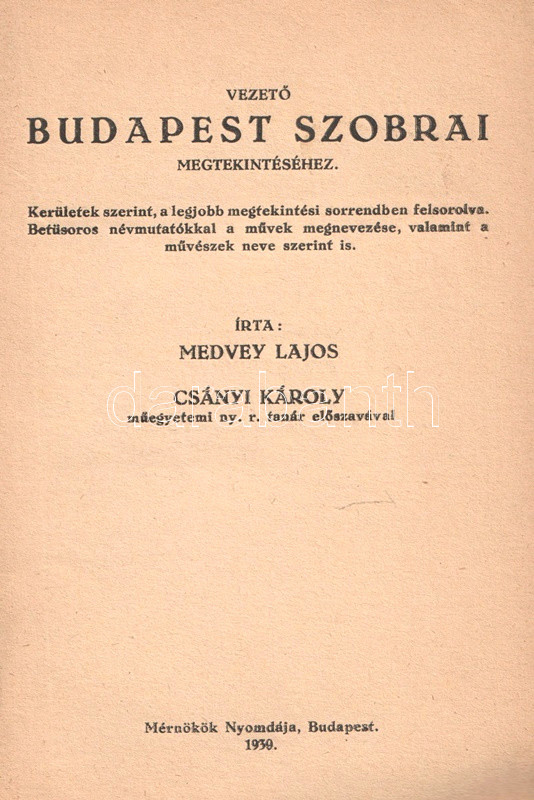Medvey Lajos: Vezető Budapest szobrai megtekintéséhez. Kerületek szerint, a legjobb megtekintési sorrendben felsorolva. Betűsoros névmutatókkal a művek megnevezése, valamint a művészek neve szerint is. Csányi Károly előszavával.