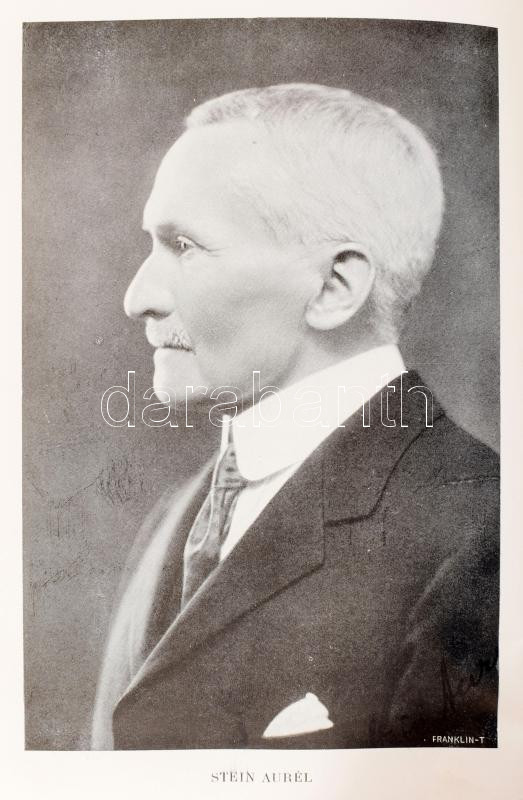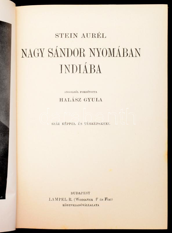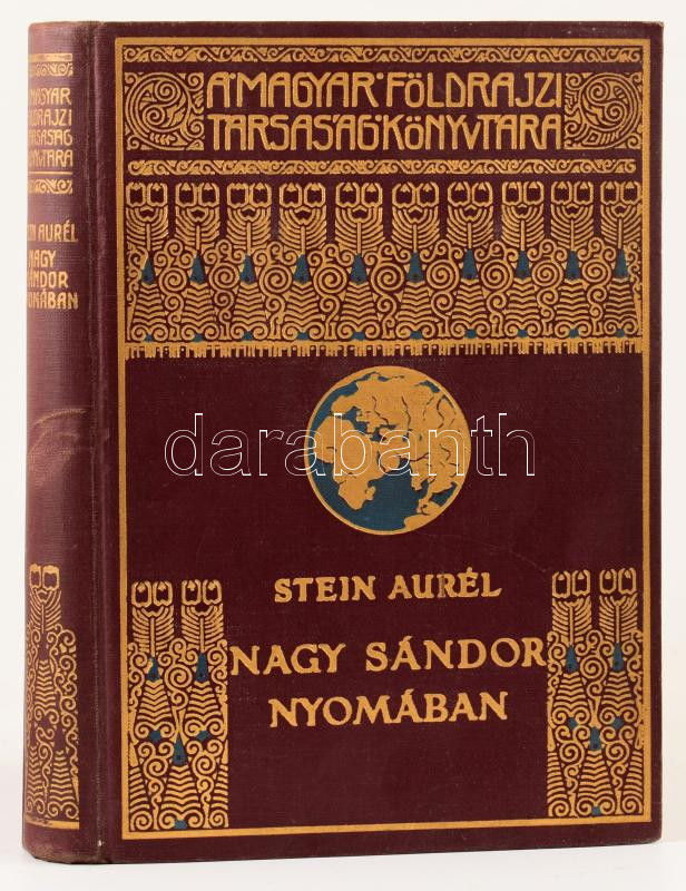 Stein Aurél (1862-1943): Nagy Sándor nyomában Indiába. Ford.: Halász Gyula. Magyar Földrajzi Társaság Könyvtára. Bp., [1931], Franklin, 1 t. (címkép)+183 p.+32 (kétoldalas fekete-fehér képtáblák). Két egészoldalas térképpel. Kiadói dúsan aranyozott egészvászon sorozatkötésben, kopott borítóval, egy lapon szakadással.
