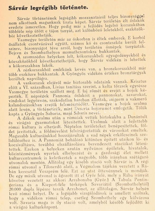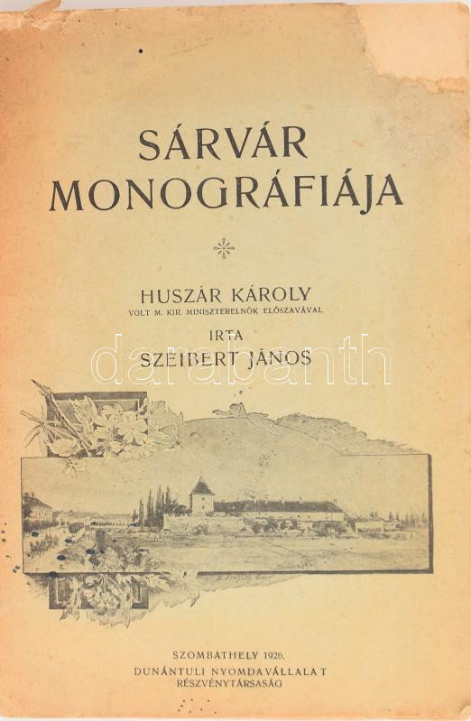Szeibert János: Sárvár monográfiája. Huszár Károly volt magyar királyi miniszterelnök, Sárvár nemzetgyűlési képviselője bevezetésével. Szabó László festőművész rajzaival. Szombathely, 1926, Dunántúli Nyomdavállalat Rt., 86+2 p.+2 t. + 2 (térképek) t. Kiadói papírkötés, a borító elvált a könyvtesttől és könyvtest szétvált, sérült borítóval, az első 5 lap felső sarka javított. Ritka!