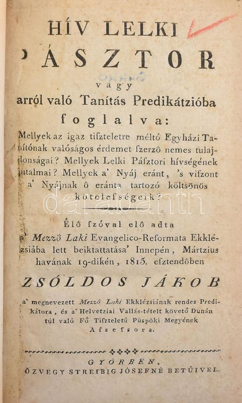 Zsoldos Jákob: Hív lelki pásztor vagy arról való Tanítás Predikátzióba foglalva: ... Élő szóval elő adta a' Mező Laki Evangelica-Reformata Ekklézsiába lett beiktatása' Innepén, Mártzius havának 19-dikén, 1815. esztendőben - - ... Győr, [1815], Özvegy Streibig Józsefné betűivel, 86 p. Átkötött modern egészvászon-kötés, régi intézményi bélyegzésekkel, javított címlappal.