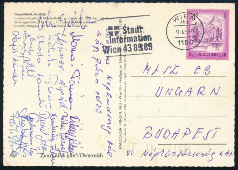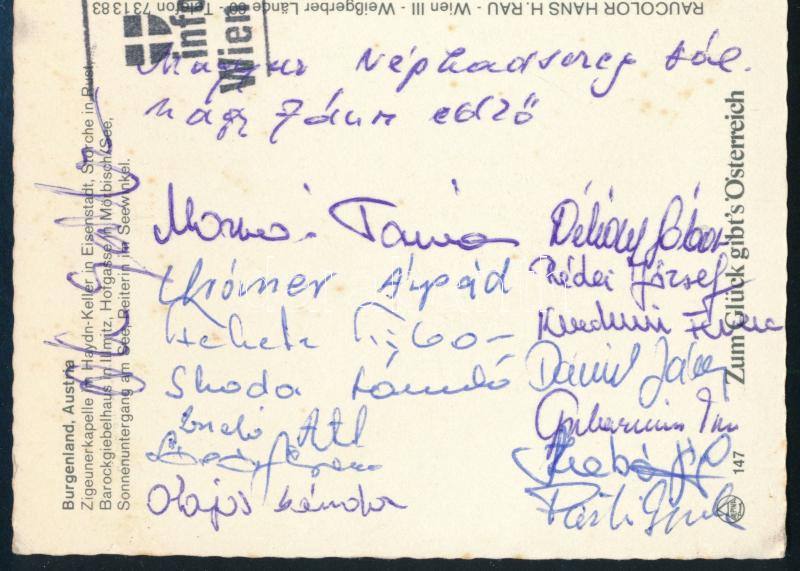 1980 A Magyar Néphadsereg labdarúgó-válogatottjának tagjai által aláírt képeslap, köztük Nagy János (Nagy II), Rédei József, Krómer Árpád, Dékány Gábor, stb., Bécsből hazaküldve