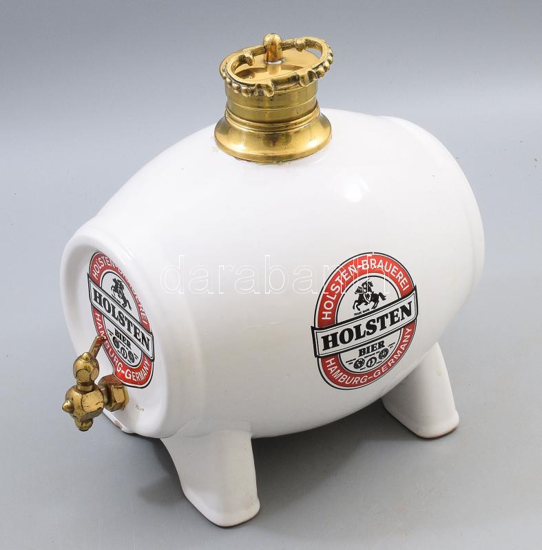 Leírás: Holsten Bier mázas kerámia söröshordó, réz szerelékkel, működik, lábán lepattanással, 24x26 cm