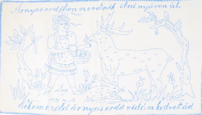 Leírás: Kézzel hímzett konyhai falvédő, "Árnyas erdőben szeretnék élni nyáron át, Nekem e zöld árnyas erdő vidám kedvet ád" felirattal, 43x76 cm