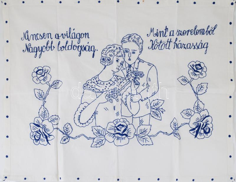 Leírás: Kézzel hímzett konyhai falvédő, "Nincsen a világon nagyobb boldogság, Mint a szerelemből kötött házasság" felirattal, 57x71 cm