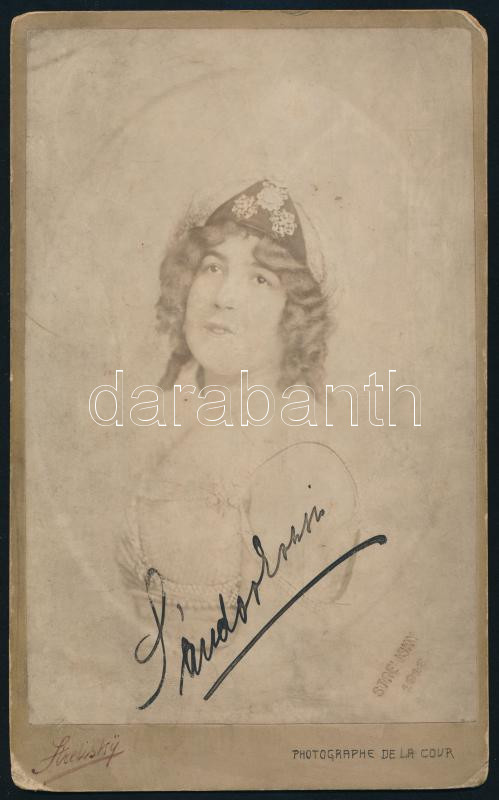 1913 Sándor Erzsi (1883-1962) opera-énekesnő, császári és királyi kamaraénekesnő autográf aláírással és dedikációval ellátott fotója, kabinetfotó Strelisky műterméből, kissé viseltes, 21x13 cm