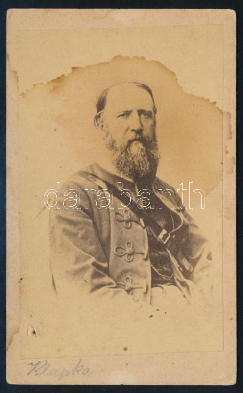Leírás: cca 1870 Klapka György (1820-1892) honvédtábornok, politikus portréja, vizitkártya, jelzés nélkül, ázásnyommal, apró lyukkal, 10,5x6,5 cm