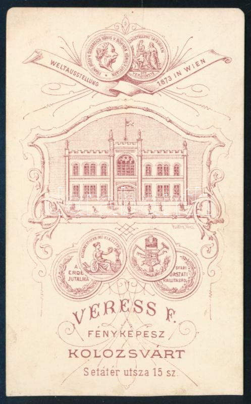 cca 1875-1880 Fiatal fiú portréja, vizitkártya Veress Ferenc (1832-1916) kolozsvári műterméből, a verzón a műterem képével, alja vágott, egyik sarka kissé sérült, 10x6 cm