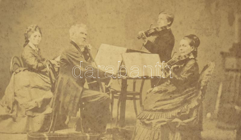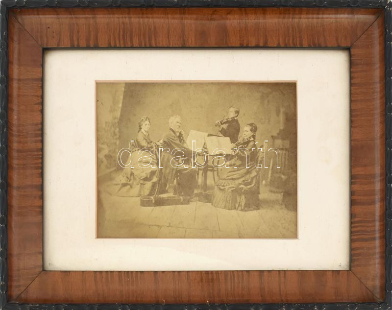 cca 1880 Plotényi János (1807-?) bányamérnök, híres ungvári zenekedvelő, Nagylázi Plotényi Nándor (1844-1933) hegedű- és zongoraművész apja, két lányával Plotényi Walburgával és Wilhelminával, valamint unokájával, Jenővel, előadás közben, hangszereikkel, fotó, a felületén foltokkal, paszpartuban, üvegezett fakeretben, a hátoldalán feliratozva, 14x18 cm, keret: 26x35 cm