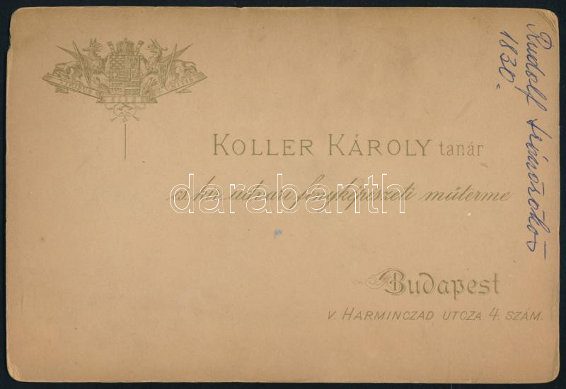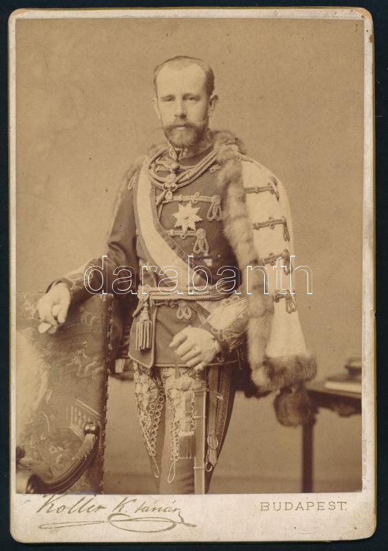 cca 1885 Habsburg-Lotaringiai Rudolf (1858-1889) osztrák-magyar trónörökös díszegyenruhás portréja (az Aranygyapjas rend jelvénye, ill. a Szent István-rend nagykeresztjének csillaga is látható rajta); kabinetfotó Koller Károly tanár budapesti műterméből, a hátoldalon feliratozva, 16,5x11 cm
