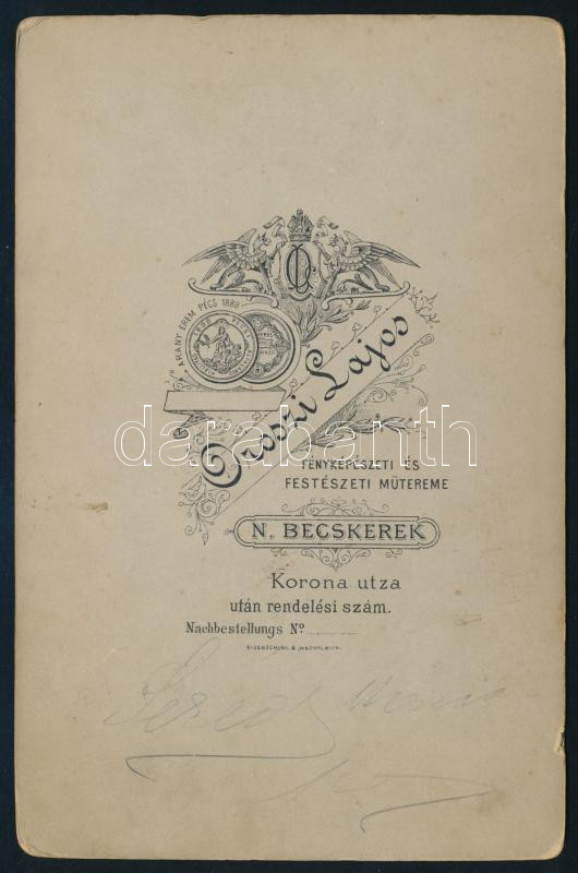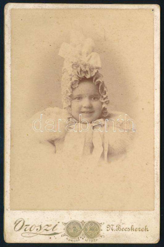 Leírás: cca 1890 Kislány díszes ruhában, kabinetfotó Oroszi Lajos nagybecskereki műterméből, kissé koszos, 17x11 cm (Ritka műterem!)