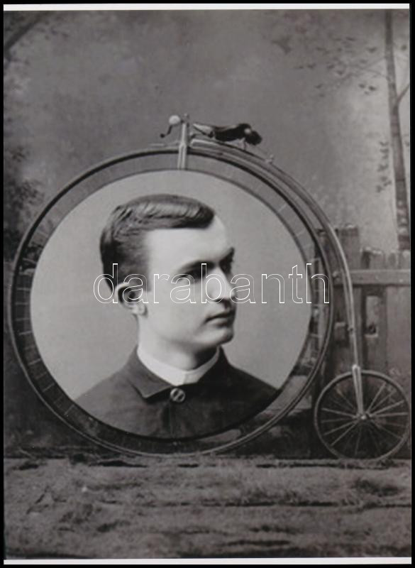 cca 1890 "Sportember, aki a velocipéd része lett", ritkán látott megoldás egy portré keretezésére, eredetileg kabinetfotó méretben, 1 db modern nagyítás, jelzés nélkül, 21x15 cm