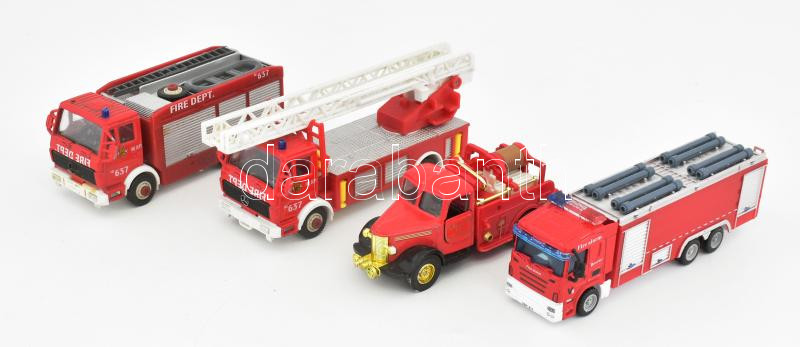 Leírás: 4 darab tűzoltó autó, fém és műanyag, kff felszereltségben, kis hiányokkal, h: 12-17 cm