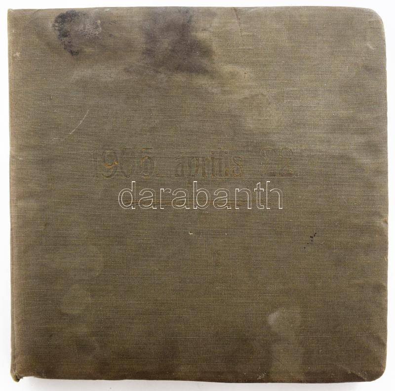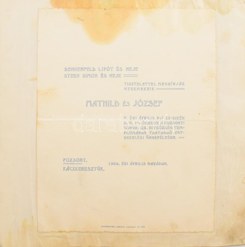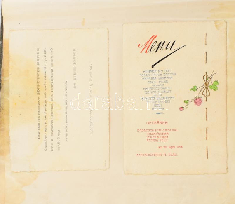 1906 Pozsony - Rákoskeresztúr, Sonnenfeld Mathild és Stern József esküvőjére szóló üdvözlő táviratok gyűjteménye, benne az esküvői menükártyával is. Nagyrészt gépelt táviratok. Vászon-kötésben, kopott borítóval, foltos lapokkal, közte kissé penészesekkel is.