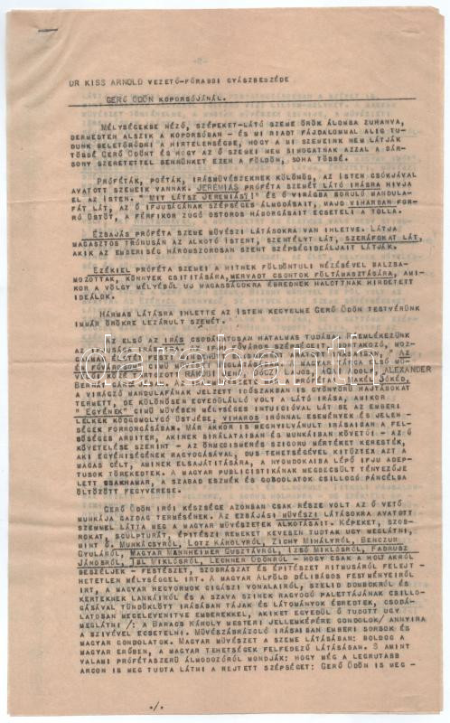 1939. november-december, Kiss Arnold (1869-1940) budai vezető főrabbi, költő gyászbeszéde Gerő Ödön (1863-1939) író, műkritikus koporsójánál. 2 géppel írt oldal, kézi javítással és kiegészítéssel.