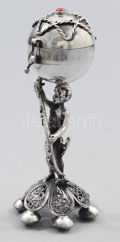 Leírás: Ezüst (Ag) gyermek figurális és filigrán díszítésű besamin tartó. 1878, orosz, jelzett, tetején kő díszítéssel, m: 11 cm, 61g