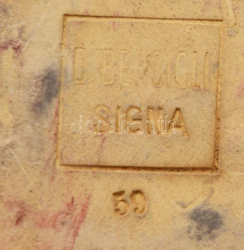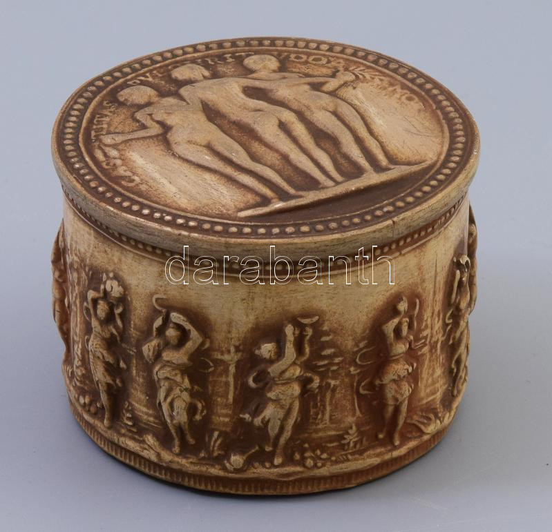 Leírás: Olasz terrakotta tégely, ókori nőalakokat mintázó reliefszerű díszítéssel, jelzett: D. Bercigli, kissé kopott, d: 7,5 cm, m: 5,5 cm