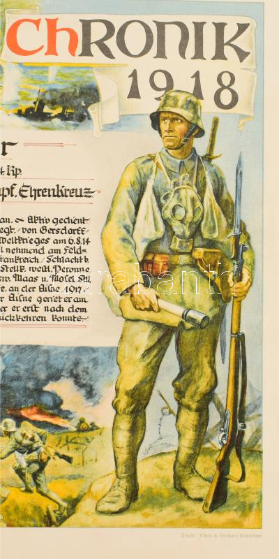 Leírás: 1920 I. világháborús katona emléklapja, vaskereszt kitüntetéssel kitüntetve. Kisebb felületi sérülésekkel 48x38 cm