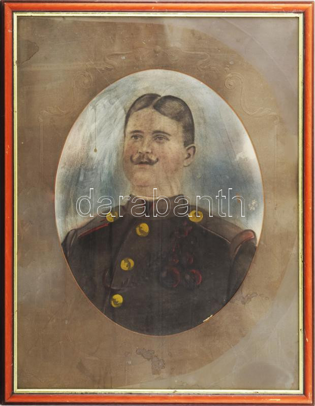 Leírás: cca 1900 Tüzér katona portréja, színezett fotó, jelzés nélkül, korabeli, szélein kissé foltos paszpartuban, üvegezett fakeretben, 47,5×38 cm