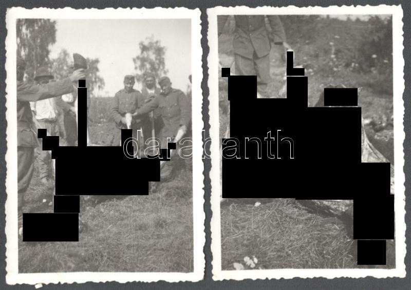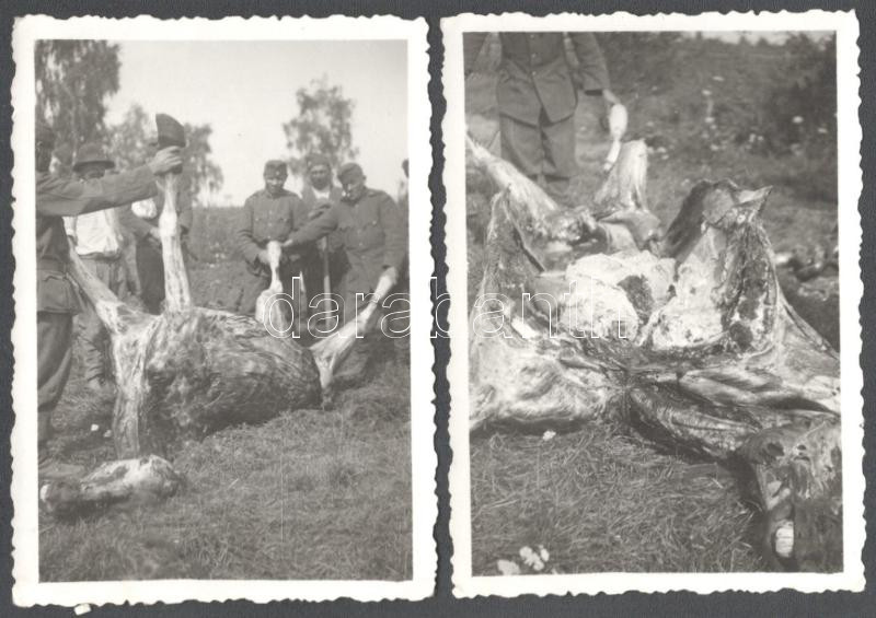 Leírás: cca 1940 Ló megnyúzott tetemét boncoló katonák, 2 db fotó, 8,5x6 cm