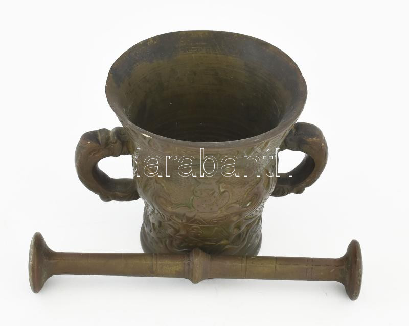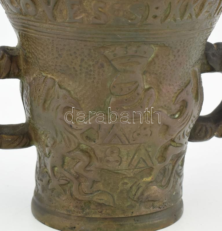 Leírás: Antik bronz mozsár címerrel, felirattal, törővel d: 11 cm, m: 11 cm