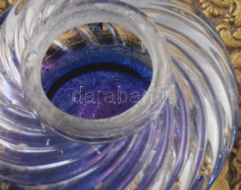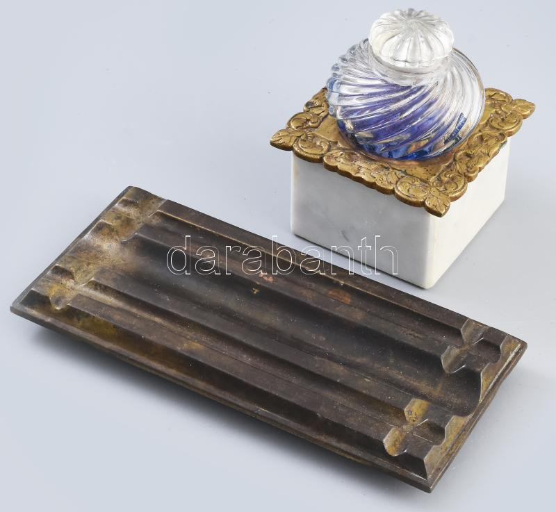 Leírás: Antik íróasztali szett, bronz szerelékes márvány talapzaton spirálos tintatartó üveg, hozzá tömör bronz tolltartó, patinás, 11x8x8 cm és 19x8,5x2,5 cm