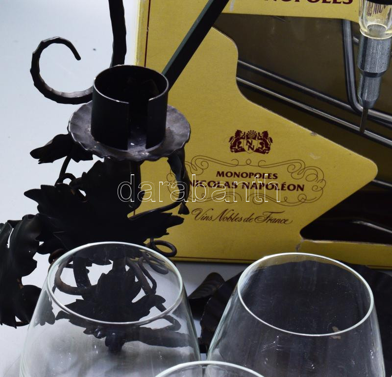 Régi szőlő- és borszervírozó összeállítás: jelzett kristály bortöltő jégtartó résszel és fém szerelékkel m: 56 cm - talpas szőlőkínáló kis lepattanással, m: 20,5 cm - bordekantáló m: 23 cm - ezüstözött alpakka szőlőmosó kopással, d: 24 cm, m: 16 cm - Nicolas Napoléon fém bortartó eredeti dobozában - 6 darabos kristály boros pohár készlet, hibátlan, m: 15,5 cm