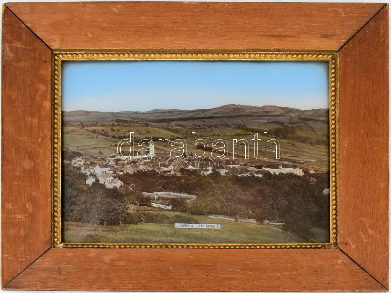 Leírás: cca 1900 Friedberg, Stájerország (Steiermark, Österreich) látképe, gyöngyház berakásos fotónyomat, fakeretben, 22x29 cm