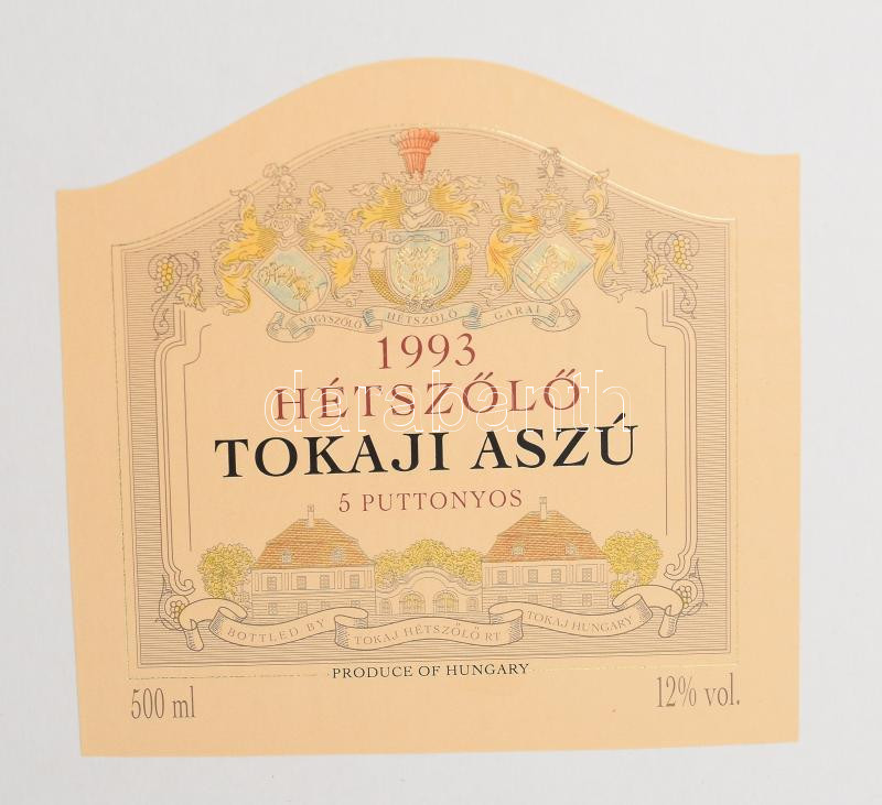 1993 Hétszőlő 5 puttonyos Tokaji Aszú, 12 db bontatlan palack édes desszertbor, eredeti kartondobozban, pincében tárolt, 12%, 12x0,5l.