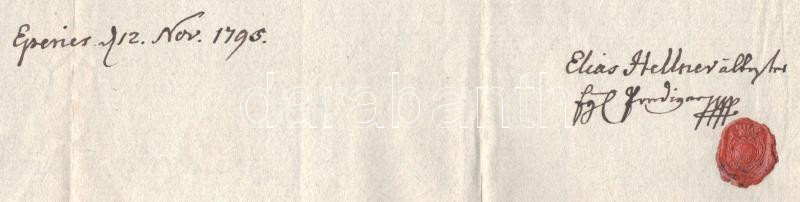 Idősebb Elias Hellner által kiadott feljegyzés, miszerint Jacob Foit eperjesi polgárnak és feleségének, Evának (szül. Korabinski) fia született, Samuel, akit 1777. dec. 18-án kereszteltek meg. A keresztszülők Johann Kriebel, Christian Kern, Anna Cornides és Dorothea Fucker lettek. A komaság nemcsak vallási, hanem szoros társadalmi és szimbolikus kapcsolatot is jelentett. A komák gyakran közeli baráti vagy rokoni viszonyt ápoltak, segítették egymást, és különös tisztelettel bántak egymással, így ez a részlet érdekes adalékkal járul hozzá az eperjesi polgárok kapcsolati hálójának történetéhez. A német nyelvű iratot Elias Hellner aláírása és gyűrűspecsétje hitelesítette.
