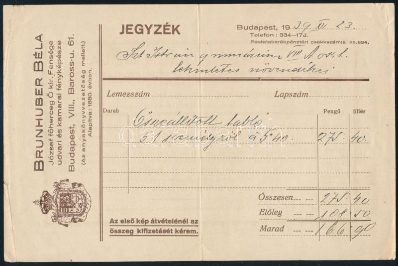 Leírás: 1939 Bp., Brunhuber Béla József főherceg udvari és kamarai fényképésze fejléces számla