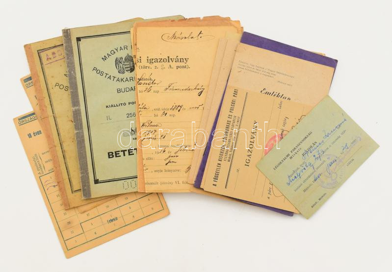 Vegyes okmány tétel, közte a miskolci légoltalmi parancsnokság igazolása, kitöltetlen FKgP igazolvány (aláírásokkal), katonai emléklap, postatakarékpénztári betétkönyvek, stb., összesen kb. 15 db