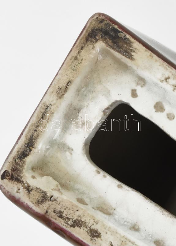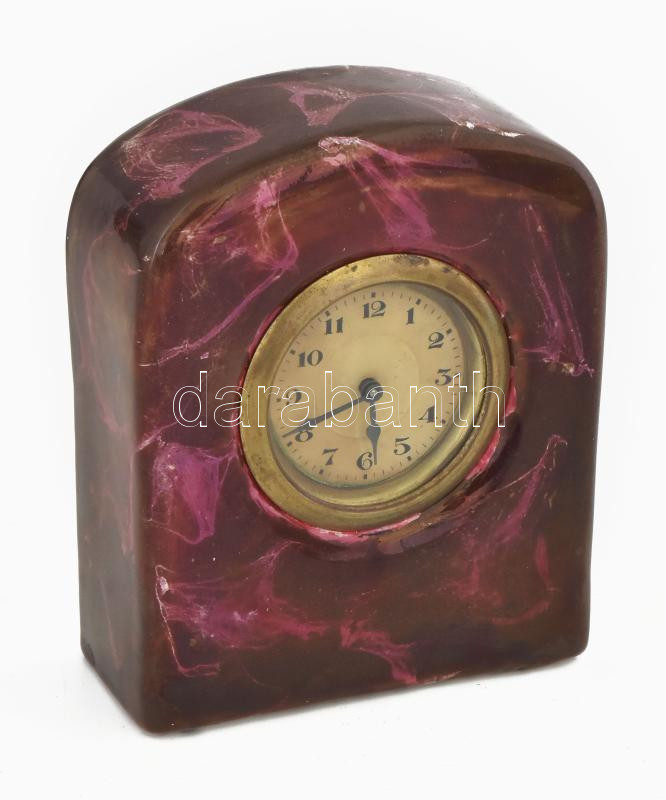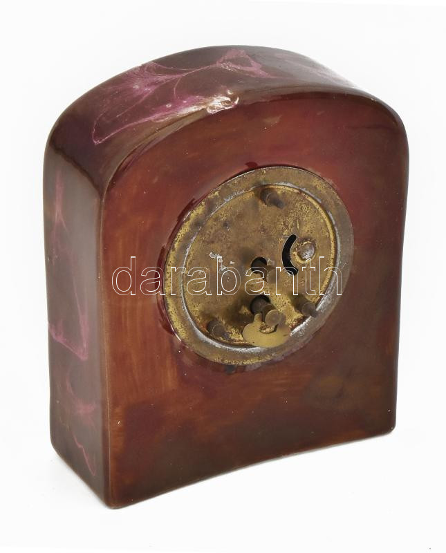 Leírás: Asztali óra, lilás színű, lekerekített tetejű mázas kerámia házzal, alján benyomott formaszámmal, az óraszerkezet tisztításra szorul, 13,5x10,5x4,5 cm
