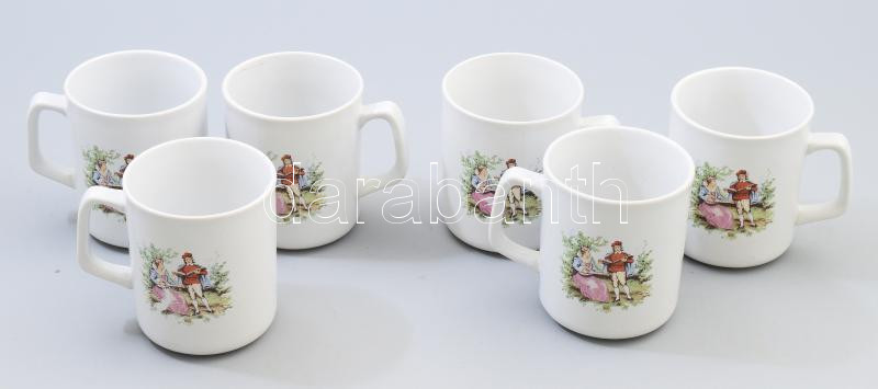 Leírás: Zsánerjelenettel díszített 6 darabos porcelán bögre szett, jelzés nélkül, m: 9,5 cm