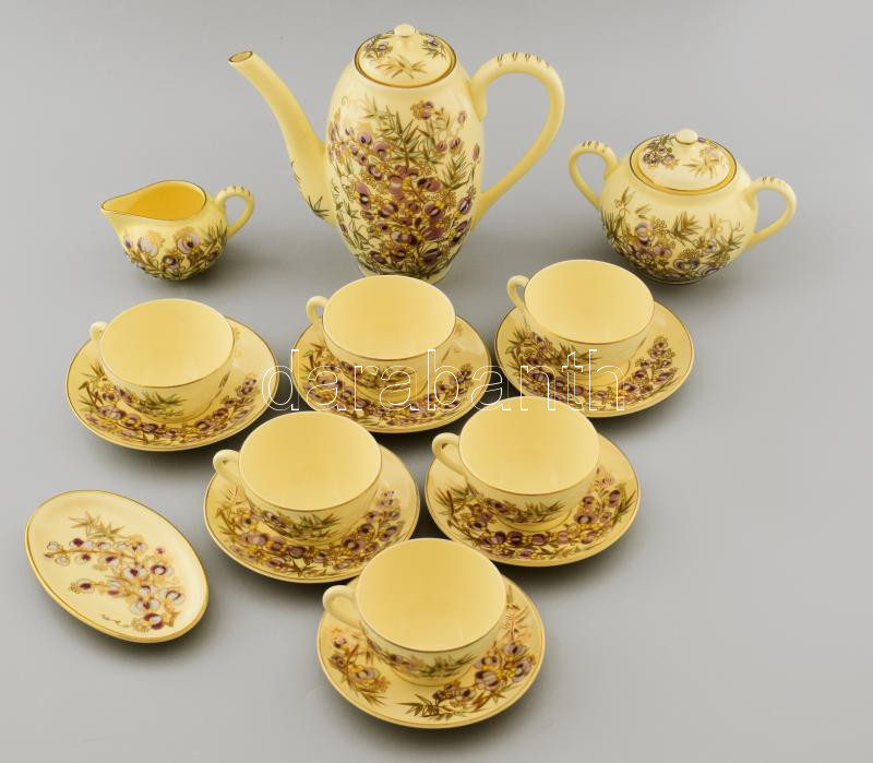 Leírás: Zsolnay aranykontúrozott virágmintás 6 személyes kávés készlet, jelzett, teljes, egyik csészén erős mázátrepedéssel, díszdobozban, leírással.