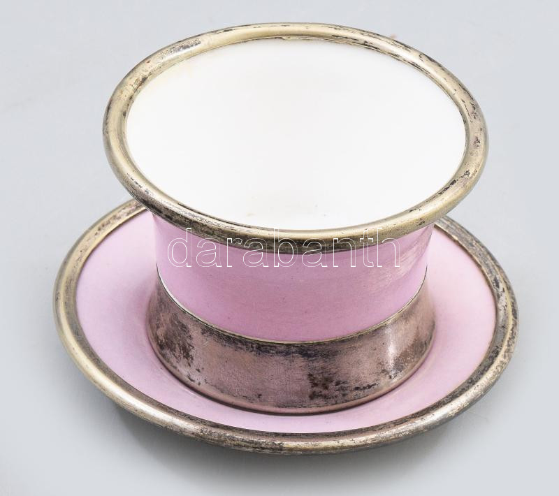 Leírás: cca 1900 Sarreguemines kétrészes fűszerkínáló, fém szerelékezéssel, aljon kis repedéssel, jelzett, m: 5,5 cm