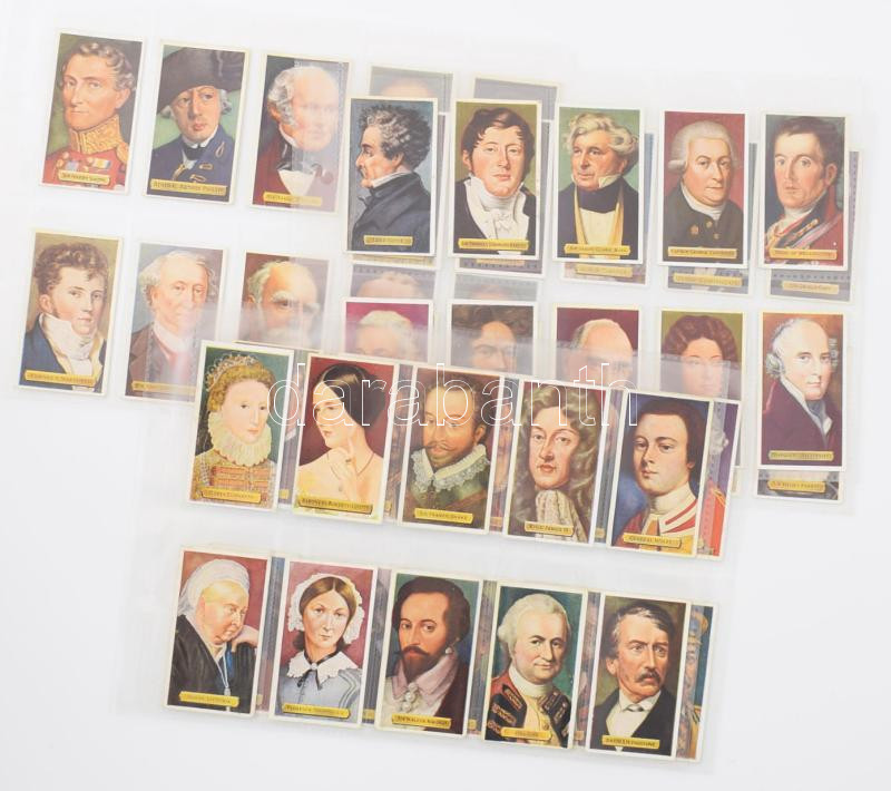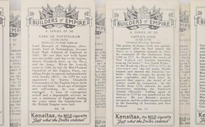 Kensitas brit cigaretta-gyűjtőkártyák, 50 db-os komplett sorozat (birodalomépítők), albumlapokon / British cigarette cards, complete series of 50 (Builders of Empire), in album sheets