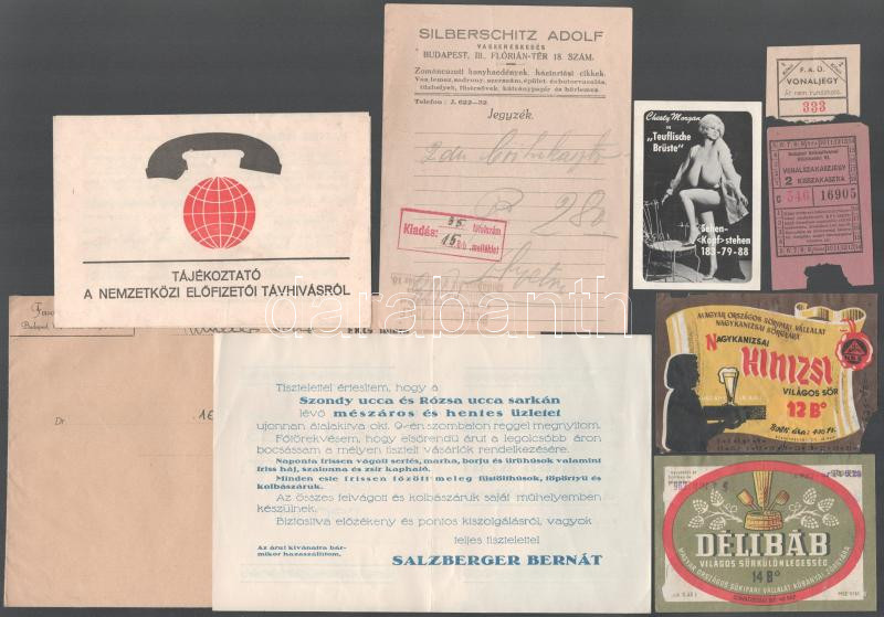 Leírás: Vegyes reklám tétel, közte Chesty Morgan erotikus előadás reklámja, italcímkék, jegyek, stb., összesen 9 db