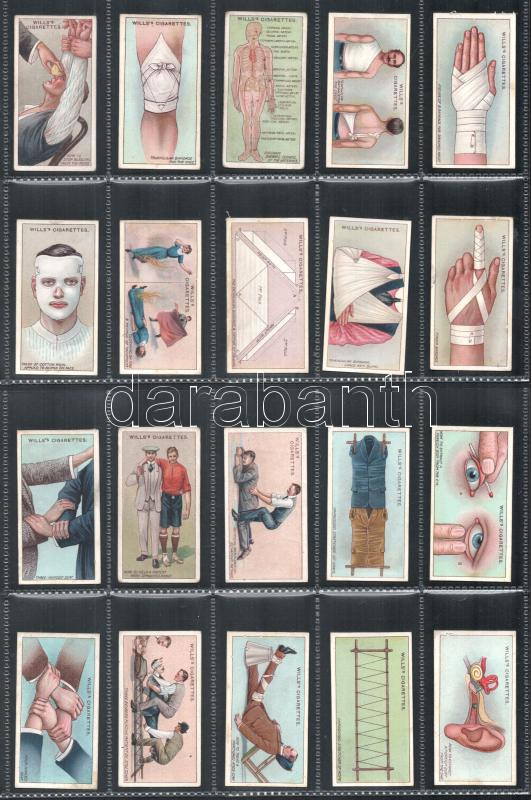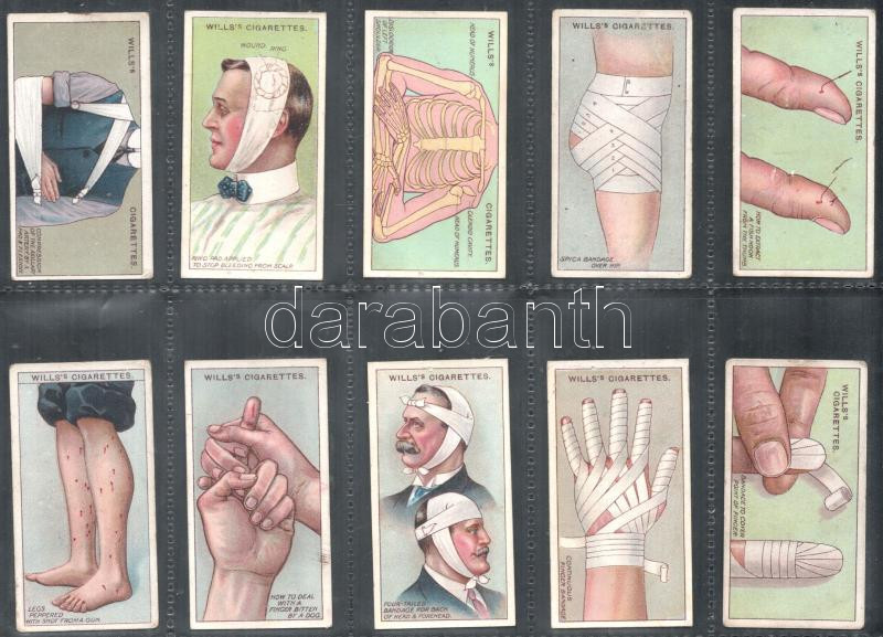 Wills's Cigarettes brit cigaretta-gyűjtőkártyák, 50 db-os komplett sorozat (elsősegély), albumlapokon / British cigarette cards, complete series of 50 (First Aid), in album sheets