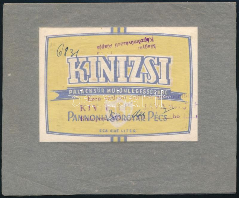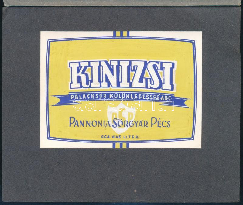 cca 1952 Cziglényi László: Kinizsi sörcímke terv, kézzel festett, kartonra ragasztva, a hátoldalon feliratozva, a hártyapapíron a Magyar [Népköztársaság] Képzőművészeti Alapja jóváhagyásával, 7,5x10,5 cm