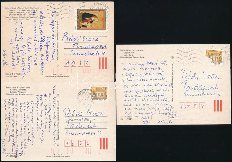 cca 1981-84 Keresztury Dezső (1904-1996) költő, korábbi korábbi vallás- és közoktatásügyi miniszter autográf, szellemes verses sorai Bódi Marának, 3 db postázott balatonfüredi és tihanyi képeslapon, Keresztury Dezső autográf aláírásával. " Ez csak egy kő, szépen rétegezett, a bejárat elég bő, a kő-réteg erezett (...)"