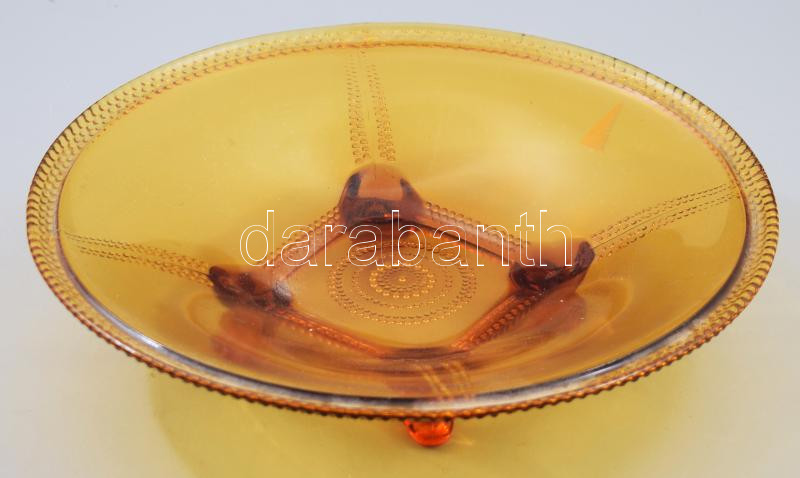 Leírás: Borostyánszínű üveg asztalközép kínáló, d: 28 cm