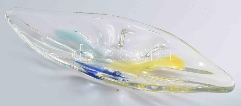 Leírás: Cseh vastagüveg asztalközép kínáló. Anyagában színezésekkel, jelzés nélkül, kis kopással, 54x20 cm