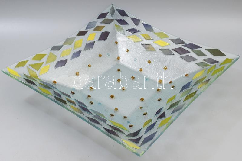 Leírás: Nagyméretű vintage asztalközép kínáló, színezett üveglap rátétekkel, hibátlan, 35x35 cm