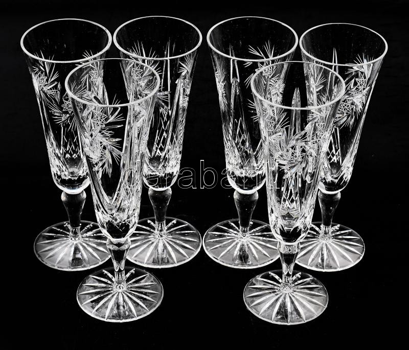 Leírás: Ólomkristály 6 darabos pezsgős pohár szett, jelzés nélkül, hibátlan, m: 19,5 cm